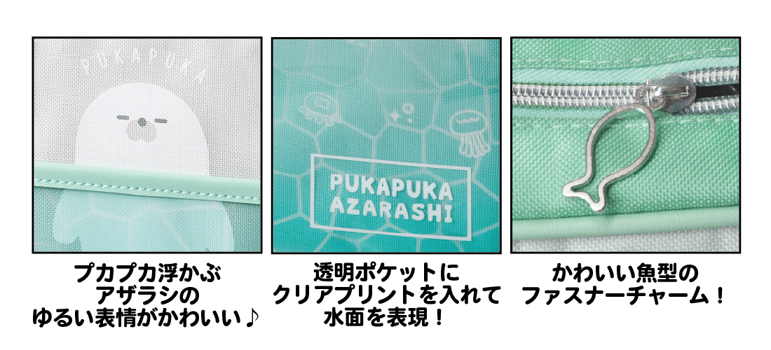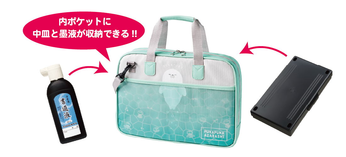 書写バッグ プカプカアザラシ 未分類 2025.10.08 01_pukapuka02_pukapuka03_pukapuka 特長 水面にプカプカ浮かぶアザラシのゆる~い表情がキュートな書写バッグ。 かわいい魚型のファスナーチャームつき。 カバンの内側に、中皿と墨液を収納するポケットがついています。 仕様 寸法:約350×65×H250mm(持ち手含まず)